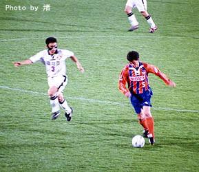 ![]() マリノスから移籍の神田(新潟出身)は、MFで登場。 得意の左足でドリブル突破をはかる。 対するサンガのDFは元ヴェルディの中村忠。 |