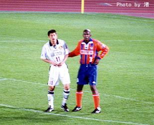 ![]() カズをピッタリマークするDFセルジオ。 セルジオって184cmあるんだけど、この写真を見ると カズもかなり大きいよねぇ。びっくり。 | ||
