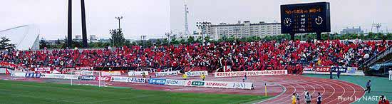 数日前「すでに売れたチケット1万枚のうち、9000枚が浦和で売れているらしい」というアヤシゲな噂を耳にしていたので、ホーム側まで真っ赤になってるんじゃ・・・とおそるおそる出かけたのだけれど、さすがにそんなことはなかった。ほっ。6:4くらいの比率だ。