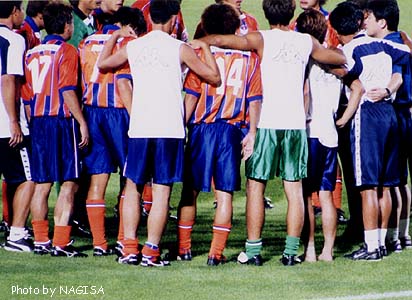 ![]() 延長前半が始まる前。選手全員で円陣を組む。 既に交替でベンチに退いた神田、木澤らも輪に入る。 木澤、裸足だ・・・ |