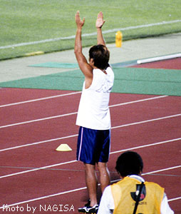 ![]() 90分を闘い終え、延長に備える選手たちに、 木澤が身振りを交えて指示を与える。 |