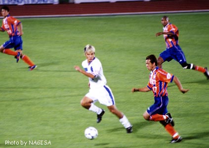 ![]() 後半は、左からの攻めが目立った。慎吾が、鳴尾が、ナシメントが走る! 中野の上がりもすばらしかったんだけど、速すぎてカメラが追いつかず(泣) セルジオの決定的なヘディングを相手DFに返されたり、木寺のファインセーブ ありだったりで、後半は双方得点が入らず、試合は結局延長へ。 |