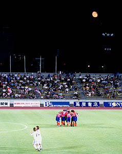 ![]() 後半。サイドを駆け上がる中野圭一郎。パパ。 後半は左からの攻めが目立つよね。スピードも落ちない中野選手。 そして1−1のまま延長へ・・・。月が赤い。 |