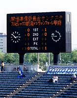 試合開始30分ほど前に市陸に到着。メインスタンドは、まだ上段の上半分しか日陰になっていない。その日陰めがけて、人が押し寄せてくる。いつになく大混雑だ。バックスタンドのホーム側は全く日陰がない。アウェイ側には、わずかに照明灯の影ができており、その影の形にそって観客が座っている。何となく笑える光景だった。