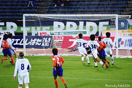 | たいてい、シュートからゴールまでは一瞬の出来事。自分の気持ちとしてはシュートをうった選手を狙っているつもりなのに、カメラの方はどうしてもボールの行方を追いかけて行ってしまうのだよねぇ。 |