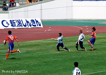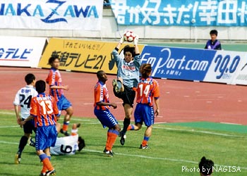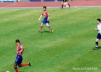 後半最初から、深澤に代わって直樹くんが入った。神田のサイドから何度か攻撃されていたんで、神田と代えて4バック組み直しかと思ったら、ぜんぜーん違った。直樹くん・セルジオ・アラケンの3バックにしたのでした。そういえばリードされてから3バックで点を取る、ってのはこの頃の一つのパターンだよね。