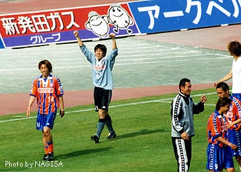 インタビューの途中で横浜側から野次がとび、メインの観客たちが声で応戦しかけたのだけれど、某ジ○イさんがすかさず「相手にしないで、黒崎の話聞こうぜっ」と仕切ってくれて収まった。ありがとう、ジ○イ!後味悪くならないで済んだよ。 |