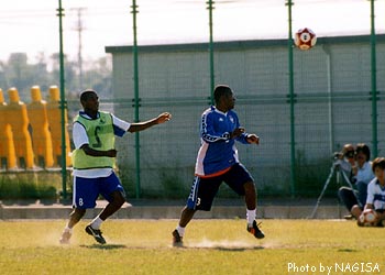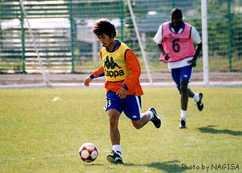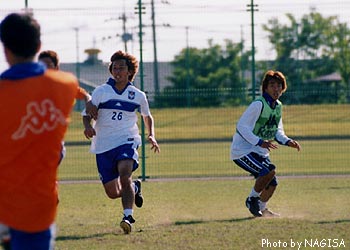 ![]() ゴール前に上がったボールを、 必死の形相で追う柴くん。 |