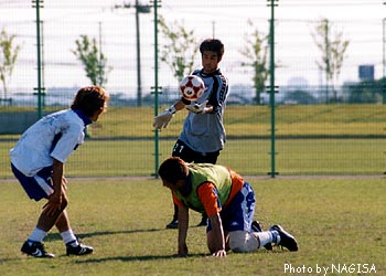 ![]() 左からのカンさんのパスを、悟くんが受けにいく。 それを左から遮ろうとしているのがアラケン。 直樹君が鋭い目線でパスコースを睨む。 |