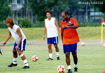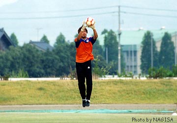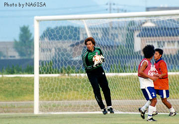 | 全国30万「前田っちファン」のみなさま 長らくお待たせいたしました! 渚のページに前田っち初登場でございまーーす。 でかいカラダにむさいヒゲ。よく通る声で、標準語と関西弁を巧みに使い分け、あなたのハートをがっちりわしづかみ。一度練習見学に行ったなら、あなたはもう前田っちの虜でぇ〜す。 とまあ、それはともかく(苦笑)、ゴールキーパーというのは因果なポジションです。 正GKがケガしたり、よほどのへまでもしない限り、交替出場する機会はめったにありません。万一交替で出るチャンスがあっても、その時に一度でもミスをしようものなら、その後二度と使ってもらえないかもしれない。しかもキーパーのミスは即失点につながるだけに、常に緊張を強いられるはず・・・。 そんな状態の中で、黙々と練習を続けるサブキーパーたち。 かれらの練習姿も、また美しいものです。 |