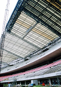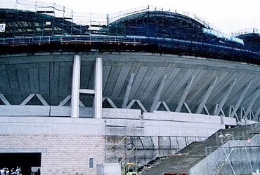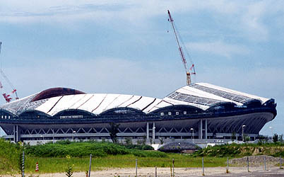 | 2002年ワールドカップ開催に向けて建設中の「ビッグスワン」。工事中の内部が見学できるというので、9月10日、行ってきました。入り口でヘルメットをかぶらされ、それが大きすぎてグラグラ。あいにくの雨模様で、傘を差し、ヘルメットを手で押さえながらカメラを構える。何ともはや・・・(笑)。ということで、写真写りもよくありません。 工事の人の説明では、上の方が出来上がったら、また見学会をするような口振りでした。客席にはまだ一部しか座席が取り付けてありませんでした(赤く見えているところ)し、グラウンドは本当にまだ手つかずです。スタンドが完成してグリーンの芝生が貼られたら、さぞ美しいスタジアムになることでしょう。 |
