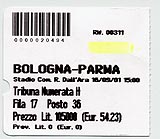 約1時間でボローニャに到着した。エミリア・ロマーニャ州の州都だけあって、パルマよりかなり大きい街だ。建物の密度も高さも段違い。 駅を出て、右手にあるATCのオフィスでバスのチケットを買う。大混雑。「ワンディチケット、プリーズ」と頼んだのだが、1回券を渡される。ああ英語が通じない・・・。いや、私の英語だから通じないのか(苦笑)?「ビリエット・ジョルナリエーロ、ペルファボーレ」と言い直してみると、おお。ちゃんと通じるではないの。よかった。無事24時間有効のバスチケット(6,000リラ=約360円)をゲット。 ホテルまではタクシーを使う。料金は12,800リラ(約800円)だったけど、ここは13,000リラ払って「テンガ・イル・レスト!」。おつりは取っておいて!、っていう意味なんだけど、こちらもうまく通じて、タクシーの運ちゃんから「グラツィエ!」と言われたよーん♪ 大通りから少し入ったところにあるホテル。フロントには初老の男性がおり、「今日は日本人がたくさんやってくるよ」と、笑いながら予約リストを見せてくれる。こじんまりしたホテルに、日本人客が4組も!「一体、何事なんだ?」っていう気持ちも分かる。きっとみんな、中田のゲームを見に来たんだろう・・・(苦笑) まだ11時前だったので、部屋の掃除が終わるまで1時間くらいかかるという。終わり次第荷物を部屋に運んでおくということなので、荷物を預けていよいよチケット・ゲットの旅へ。 バス乗り場のあるマッジョーレ広場は、ホテルから歩いて5分強。広場前に幾つかあるバス停の中から、14番のバスが止まるバス停を探し出し、スタジアムが何番目の停留所になるかを確認。なにせイタリアのバス、車内放送がない。降りる人は「次降ります」というボタンを押さなくちゃならない(これは日本と同じ)んだけど、「次は○○です」と案内されるわけではないので、停車したり通過したりするバス停の数を数えながら、自分で適当なタイミングにボタンを押さなくちゃならない。いやー、これは大変でした(泣)。 幸い、スタジアムの方面に行くバスは、ほぼ各バス停に停車してくれたので数え間違うこともなかったし、スタジアム前で降車する人も多かった。かくして、無事スタジアム「レナート・ダッラーラ」に到着! キックオフ予定は3時だが、まだ12時にもなっていないので、さすがに人影はまばら。それでも、スタジアム前の道の角にはもうグッズを売る出店が出ていた。 チケット売場がどこなのか分からなかったので、スタジアム回りを歩いてみる。ボローニャらしい柱廊(ポルティコ)の下を歩いていくと、バール(エスプレッソを立ち飲みしたり、ちょっとした軽食がとれるところ)があり、日本人らしき若いカップルが店員にチケット売場の場所を聞いているようだった。さっそくご相伴に預かって(笑)場所を聞くと、向かいの広場の「変わった形の建物」がチケット売場だという。ちょっと行ってみると、確かにそれらしいような、薄汚い鉄格子の窓口がある怪しげな建物があり、なんか日本人の若者がうじゃうじゃたむろしている。ぐわっ(驚)。窓口が開く時刻も諸説紛々らしく、みんな右往左往してた。 近寄って窓口の表示をチェックするが、書いてあるのはdistinto(バックスタンド)側の値段表だけ。どうもこちらは「バックスタンド側のチケット売場」であるらしい。ということは、反対側にメインスタンド用のチケ売場があるはず。ぐるっと歩いてちょうど反対側に行ってみると、これまたフェンス沿いに、言われないと分からないような小さい窓口があって、ここにも日本人が二人並んでいた。表示を見ると、こちらの売場はtribuna(メイン)側の値段が書いてある。よし、こっちでいいのね。 そこで先客の日本人の方に話しかけてみる。チケット売出しはキックオフ2時間前なので午後1時から、ということらしいが、正午の時点で並んでいるのは我々夫婦を入れて日本人4人だけ。ぷぷっ。そんなに焦らなくてもチケットは手に入る、ってのはホントだった。 「順番を取ってて上げますから、お昼食べてきたら?」という優しい言葉に甘え、近くのピッツェリアでピザを食べ、20分ほどで戻ると、やはり並んでいるのは彼らだけ(笑)。その後はしばらくおしゃべりしながら窓口が開くのを待つ。女性の方は半年前からペルージャの外国語大学にいるそうで、昔からのサッカーファンだそう。ビッグスワンやアルビレックスのことも知っていて、異国の空の下、渚@大感激。 1時に近くなってくると、さすがに数十人の列が出来始めた。あーよかった、並んだ甲斐があった(苦笑)。ボローニャFCのオフィシャルサイトに載っていた座席区分図を印刷して持っていったのだが、列に並んでいた何人かの日本人の方から「見せて下さいますか」と頼まれた。お役に立てて嬉しいわ。 時間通りに窓口が開き、予定通りtribuna coperta numerataのアウェイ寄りを2枚ゲット。105,000リラ(約6,300円)×2。メインスタンドの端の方の席なんだけど、高いよね