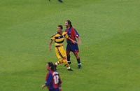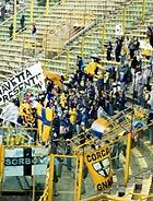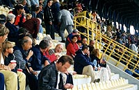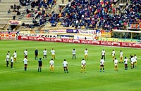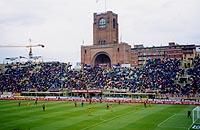 ![]() スタディオ・ダッラーラのメインスタンド 年配や家族連れが多い ![]() ゲーム前に黙祷 ピッチはすごくきれい! ![]() 熱狂なんだか、ヤケクソなんだか パルマサポーターは熱い ![]() 中田とオリーベ ペルージャ時代が懐かしい・・・ ![]() バックスタンドはこんな雰囲気 | 9/16 | いよいよスタジアムに入る。 雨が降っているせいか、スタジアム内にはまだそんなに人が入っていなかった。アウェイ側クルヴァ(curva opositi)では、パルマサポーターがすごい調子で気勢を上げている。場所的には、駒場のいわゆる「出島」。金網で囲ってあって、両側に係員が並んでいて、まさに隔離状態。 ホーム側のG裏はまだ五分の入り。みんな、アウェイサポが大声張り上げているのなんか全然無視(笑)して、のんびりとゲーム開始までの時間を楽しんでいるようだった。 ボローニャのスタジアムの定員は約4万。国立競技場みたいなすり鉢状のスタジアムで、屋根があるのはメイン側のみ。バックスタンド中央の後部には、大きな塔がそびえていた。見た感想は「え、これで4万も入るの?」。競技場としてはビッグスワンの方がずーーっと規模が大きく見えるのだが・・・。やっぱ、サッカー専用でピッチサイドぎりぎりまで座席があるから、収容人数が多いんだろっか? うちらが座ったのは、メインの中でも端の方の、アウェイよりの席。コンクリートの上に、一応こじんまりした背もたれ付きの黄色いプラスチックの座席があり、それぞれに座席番号が書いてある。座り心地はそんなに悪くなかった。屋根が大きくはりだしていて、全く濡れる心配もなかった。 スタジアム内をウロウロ探検したり、入り口でもらったマッチデープログラムを読んだりしているうちに、選手がピッチ上に出てきた。全員がユニフォームの上に白Tシャツを着ていて、円になってNYのテロ犠牲者に黙祷を捧げる。 ホーム側G裏もいつの間にやら満員になっていたが、ほとんどの人が赤とか青とか黄色とかのポンチョを着ているので、全然「チームカラー一色」じゃない。ってゆーかー、チームカラー自体が2色だからなあ・・・。それに比べてパルマサポは、雨に濡れるのもかまわず、レプユニ着たり、中田の代表ユニ(!)着たり、少人数ながら大爆発。 いよいよキックオフ!と同時に、G裏で発煙筒が焚かれる。スカパーの中継でおなじみ、白〜く煙るピッチ上。 ゲーム展開は、なんだかパッとせず、つまらない・・・。 パルマのFWはディバイオとボナッツォーリ。あーよかった、ミロシェビッチじゃなくて(苦笑)。とは言っても、なかなか攻めの形が作れない。前半途中にかなり押し込んだ場面もあったんだけど、ボローニャの寄せが早いし、パスの出し所を探しているうちに状況が悪化してしまう。中田とFWとの連携が悪いのか、DFやボランチから中田にパスのはいるタイミングが悪いのか、とにかくつながらない。 ボローニャがサイドからの攻撃を何度も繰り出すのに対し、パルマは中へ、中へと出してはカットされてしまう。あー昔こんな試合を観たなあ、リードされた焦りでどんどん状況が悪くなる試合・・・。代表の試合だったか、アルビの試合だったか・・・。だんだんボンヤリ回想モードに入る渚。 動きのよさで目立ったのは、ジュニオールとカンナバッロ。いやま、カンナバッロが目立ってもしょうがないっすか(泣)。 ところで。笑。 前半、シニョーリがDFの裏をついて、キーパーと1対1に!パルマのGKフレイは果敢にGエリアを飛び出し、胸でトラップしてはじき返す! っとここで、「キーパー、ハンドじゃねえのかよー!!!」という激しいブーイングが、場内一斉にわき起こった。いやま、すごいったらありゃしない。もう、ブーイング、なんてもんじゃないです。スタジアム全体が「ゴジラ」と化し、「ゴーーーーッ!!」と地鳴りを上げながら、審判に向かって怒りの炎を噴射してる、っていう感じですか。何事かと思いました(爆) クルヴァのサポーターは、試合中ずーっと(というか、試合展開に関係なく?)、旗を振り歌を歌い太鼓を叩き手拍子をし、応援を繰り広げてるわけだけど、メインのお客さんは、「あーでもない、こーでもない」と言いながらサッカー自体を楽しんでるふう。そして要所要所で、ナイスプレーなら激しく拍手し、ラフプレーには抗議をし、審判がファウルを見逃したと思えば激しいブーイングを浴びせる。ホントに激しく。 さっきまでニコニコ試合を観てた70歳は超してるだろうというジイさんが、真っ赤な顔して立ち上がって「ハンドだーー!!」と手振りで言ってる姿は、なんだか神々しくもあった。歴史の重み。 試合は結局、「1−0」でホームのボローニャの勝利。 一時は雷も鳴り、土砂降りとなった雨も、ゲームが終わる頃には止みかけていた。肌寒かったし、さっさと帰ろうとバス停に向かう。すごい人だったので、14番のバスを待っていても乗れるかどうか分からない。「たしか、20何番とかいうバスもマッジョーレ広場に行く