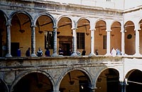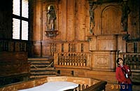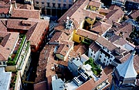 ![]() 歩いて上まで登りました 高さ98m ![]() 塔の上から見た街並み ![]() ボローニャ大学の、とある学部内 ![]() 旧ボローニャ大学 左の壁面に飾ってあるのが「紋章」 ![]() 解剖学教室 | 9/17 | ボローニャに来たからには、塔に登らねばならぬ。ヨーロッパ最古の大学、ボローニャ大学にも行かねばならぬ。ということで、ボローニャの朝は忙しい。昼まで荷物を預かってもらうことにし、とりあえずホテルをチェックアウト。 早朝から見学が可能なサン・ペトロニオ教会を見、マッジョーレ街を散策したあと、アシネッリの塔に向かう。ボローニャの2つの塔はいずれも12世紀に建てられた物で、この時期は皇帝派と教皇派が競って高い塔を建てたんだって(受け売り)。 塔の入り口の階段を登っていくとチケット売場がある。おしゃべりに夢中でやる気のなさそうなお姉ちゃんからチケットを買い、延々と続く階段を登りはじめる。全498段。細長い塔の内壁にらせん状に取り付けられた階段は、かなり急で、踏み幅も狭い。足の大きい男の人だったら、踏み外しちゃいそう。途中、何ヶ所か板張りの踊り場が設置してあって、休めるようにはなっているんだけど、まるで登山だ・・・。 日本人らしき若い男性が下ってきたので、「まだまだですか?」と聞くと、「そうですねー、まだまだですねー(笑)」。 どれくらいかかったろう、足がガクガクになりながら、ようやく塔の頂上にたどり着く。天候もよく、眺めは最高!風も心地よい。そして何より、ボローニャの煉瓦色の街並みが美しい!圧倒されます。 前日、スタジアム行きのバスから見た風景からすると、古い建物が建ち並ぶ旧市街と、新しいアパートや住宅地が広がる新市街とは、大きな環状道路を隔ててくっきり分かれているようだった。サン・ペトロニオ教会とマッジョーレ広場を中心にして放射状に道路が伸び、円形に街が広がる中世都市。その中世の街が、いいところをそのまま残しながら発展してきているんだなー。 狭い階段は、下りも恐い(笑)。ふーふー言いながら下まで降りる。次は、現在のボローニャ大学を見に行く。 塔の下からボローニャ大学へと続く道は、本当に「学生街」という雰囲気。本屋があり、ポルティコの下にはカフェの椅子が並び、柱や壁には、たぶん「アルバイト募集」みたいな感じのチラシがたくさん貼ってある。本を抱えた学生さんたちがたむろしたり、道を闊歩していく。 大きなキャンパスもあるのだが、道沿いにいくつかの学部の建物があるみたいだったので、こっそり門から中に入ってみた。中世貴族の館をそのまま使っているようで、広い中庭がある。それを取り囲むようにして回廊があり、教室がある。のぞいてみると、階段教室があったり、小さなゼミ室みたいのがあったり・・・。 新しい大学、といっても、旧ボローニャ大学が使われていたのは1803年までだそうだから、もう200年近くこちらで学生さんたちが勉強しているわけだ。ほおおおお。 ということで、今度は旧ボローニャ大学を見学へ。昨日は休館日だった上に場所すら見つけれなかったんだけど、地図を頼りに行ってみると、今度はすぐに分かった。昨日は扉が閉まっていたので、気づかずに通り過ぎちゃったみたい。 旧ボローニャ大学は、16世紀建造の天井の高い建物で、中庭が美しい。回廊や廊下の壁には、たくさんの紋章が飾ってあった。ここで学んだ学生や教授の紋章だという。ということは、やっぱり、貴族の子弟が学んでいた、ってことなのかな? 建物内の「テアトロ・アナトミコ」教室を見に行く。人体解剖の講義が行われた教室で、正面には講義用の演壇、中央に解剖台(木造のテーブルの上に石製の台)があり、それを取り囲むような階段教室になっている。教会の反対をものともせず、世界で初めて人体解剖の実習が行われたという。さすが、自由都市ボローニャ! 第二次大戦で建物がかなりの被害を受けたそうで、爆撃で壊れた建物や修復の様子などが写真で展示してあった。 昼になった。ピザやスパゲッティはもういいや、って感じだったので、シーフードのリゾットを食べる。久しぶりの米(笑)。やっぱりご飯はいいよね。うん。 ホテルに戻って荷物をピックアップし、マッジョーレ広場からタクシーで駅に向かう。さて、次はいよいよフィレンツェだ。 自動販売機で、フィレンツェ行きのES(ユーロスター:新幹線)の2等指定席の購入を試みたんだけど、何度やっても最後の購入画面でエラーになってしまう。仕方がないので、窓口で切符を買うことにする。行き先と列車番号などを紙に書いて「この切符が欲しい」と係員に見せると、イタリア語で「$#・・&%*@!」とのこと。はあ?。今度は英語で「&%$#@*, 9 or 10」。最後の「9 or 10」しか聞き取れない。切符はちゃんと発券されたので、代金を払う。日本円で一人1,500円ほど。 買った切符を見ると、指定を頼んだのに席指定が書いてない。確かESは座席指定が必須のはず・・・。えー、どうしよう。窓口