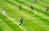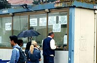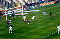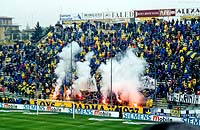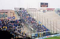 ![]() パルマのホームスタジアム スタディオ・エンニオ・タルディーニ ![]() チケット売場はプレハブ 席種ごとに窓口が違う ![]() 女性用のチケット 割引値段で男性用より小さい ![]() ブレシアのサポーター ![]() パルマ側G裏 ![]() 攻め込むパルマ 中央ミロシェビッチがポストに ![]() ボールを持って上がっていく中田 | 9/23 | 昼過ぎにパルマの駅に着いた。降りた乗客十数人の内、半分以上が日本人・・・(苦笑) まずはスタジアムまで行って、チケットを入手しなければならない。雨の中、タクシー乗り場で10分くらい待ってると、ようやくタクシーが来た。この様子では、帰りにタクシーをつかまえるのは無理そう。ちょっと不安になる。 スタジアムは、緑に覆われた住宅地の中にあった。近くの出店をのぞいてみる。パルマのピン・バッチ(去年のユニのバージョン)をお土産に数個購入。夫はパルマカラーのニットマフラーを買った。 そんなこんなしているうちに、スタジアム正面にあるプレハブのチケット売場が開いた。いくつかのカテゴリの値段が表示してあったが、どれがどの辺の席なのか分からない。とりあえずはtribuna席を買えばメインに座れるだろうと思い、tribuna centrale estの席を購入した。値段が二通り表示してあったので「?」だったのだが、売場の女性が書いてくれた説明によると、同じ席でも男性が100,000リラ、女性が65,000リラなのだった。 スタジアムから見て左手にあるピッツェリア&リストランテで昼食。その後、バス停でバス時刻の確認。駅まで歩くことも考えて、表示してあったバス路線図で駅までの道順をチェック。前半終了間際に席を立てば、徒歩でも間に合いそうだ。よし。 午後2時を過ぎると、ずいぶん賑やかになってきた。大型バスがやってきたかと思うと、窓から身を乗り出したブレシアのサポーターが「バッジョ!バッジョ!ロベルト・バッジョ!」と両腕を振りながら大声で叫んでいる。あんたら、喧嘩売りに来たんか〜(笑)。あちこちにパトカーが止まっていて、銃を持った警官が何人もスタジアム周辺をパトロールしていた。 いよいよ開場になったので、正面入り口へ。ところが、チケットを見せると、「この席の入り口はこっちではない。反対側の入り口に回れ」と言われた。なして〜(泣)。 (tribunaだから正面側、と思ったのは私のミス。座席の呼び方はスタジアム毎に違う。ボローニャの場合はそれでよかったのだが、このエンニオ・タルディーニ・スタジアムでは、tribuna centrale estはバックスタンドの中央席のことだったのだ。後の祭り。パルマのオフィシャル・グッズ・ショップは、スタジアム正面側にある。そこでいろいろお土産を買おうと思っていたのに、バックスタンドに行けとは・・・。もお、がっかり。) パルマのバックスタンド上部は、鉄パイプと木材で組み立てた仮設スタンドのようになっている。係りのおじさんの指示で、工事現場のような階段を登って席に着く。座席も通路も木製なのだが、スタジアムは禁煙ではないらしく、みんなスパスパたばこを吸ってて、正直恐かった。火事になったらどうするん。 選手紹介が始まった。文字しか出ない電光掲示板に選手の名前が表示されていく。とにかく中田先発でホッとする。FWはミロシェビッチとボナッツォーリ。「なぜディバイオを出さん、ウリビエリ」と呟いてみたり。ピッチ上に選手が出てきた。走り回るバッジオ様のお姿に、はあと!こんなところで生バッジオ様にお目にかかれるなんてー!!シアワセ!ブレシアには、元ペルージャのマッツォーネ監督もいるし。きゃーきゃー。 いよいよキックオフ。今日の中田は積極的。どんどんシュートを打っていくつもりのようだ。パスの出し所がないのは相変わらずの様子。ミロシェビッチはスペースに走り込むタイプじゃないし、ブレシアもガッチリ守っているので裏をつくのも難しそう。出し所がなきゃ自分でシュートだっ!ってことか。 それにしてもパルマの観客はきびしい。ミスには敵味方問わずブーイング。中田のパスミスにも容赦ないブーイング。さらに、今日のブレシア・サポーターの標的は中田らしい。日本のスポーツ紙では「10番対決」とか言って中田とバッジオを並べて扱っていたみたいだけど、前日のガゼッタにも、ちょこっとそんな記事が載っていた。ブレシア・サポからすれば、「アッズーリの至宝バッジオ様を、お前みたいなヤツと一緒にされてたまるか」みたいなとこもあったんじゃないかな。敵からも味方からもブーイングを浴びせられて、ホントに大変そう・・・。よほどタフでなきゃやってけないよねえ。 ブレシアの応援はすごくて、三々七拍子みたいな手拍子を全員で一斉にやるんだけど、ぴったり揃ってて大迫力。人間の手だけであれだけの音量が出せるとは。ちょっと驚きデス。アウェイに乗り込んでくるだけあって、すごい気迫を感じた。 残念だったんだけど、0−0のままの前半終了間際で席を立つ。15時45分。地図とメモを頼りに駅